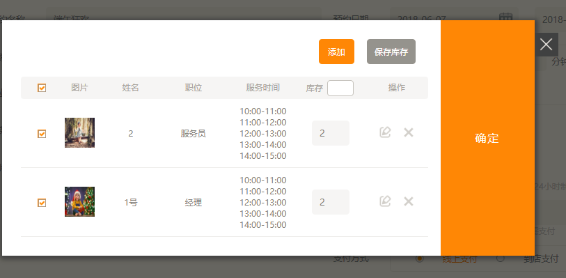 (库存说明:服务员的库存,也就是这个时间段内这个服务员可被预约的次数是2次,即总的次数)